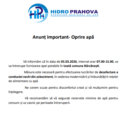 ANUNT OPRIRE APA ÎN DATA DE 05.03.2026